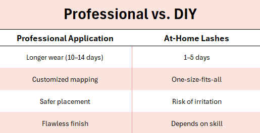 Instead of applying one lash at a time, small groups of soft lash fans are placed along your lash line to create a fuller, fluffier look — in a fraction of the time.